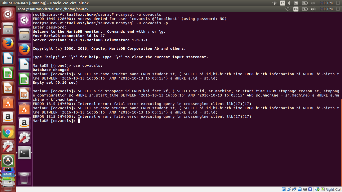 ERROR 1815 (HY000): Internal error: fatal error executing query in crossengine client lib(17)(17)