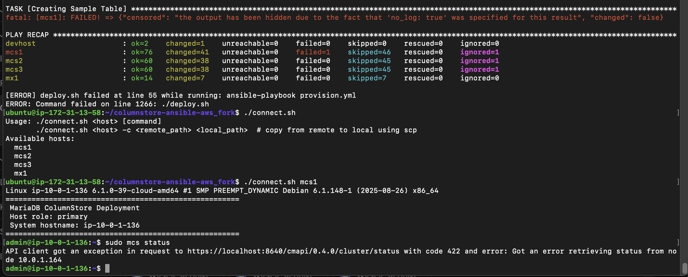 When trying to deploy a cluster of 3 nodes with columnstore-ansible-aws script