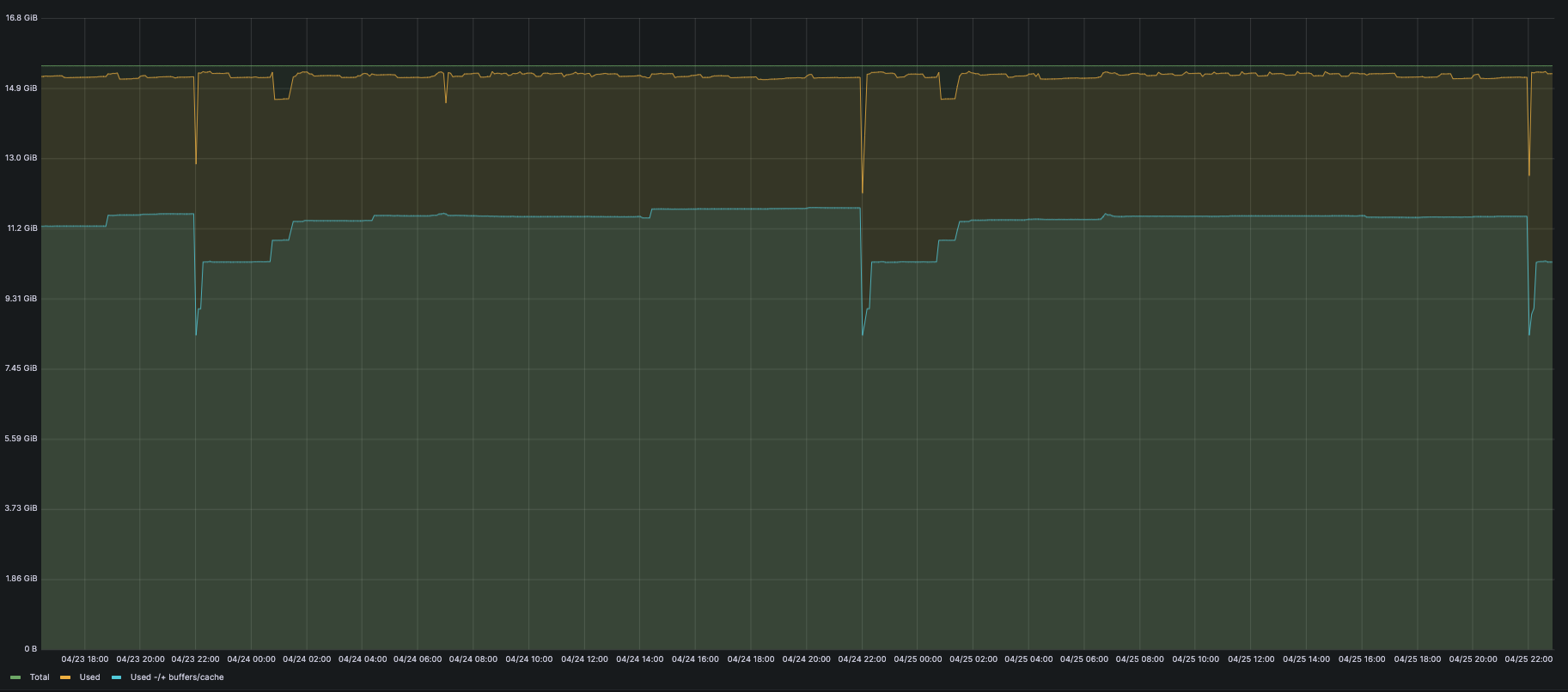 1) After a service restart, the "normal" (backup/restore using mysqldump/restore disabled/not executed) memory usage seems to be around 11.5/12 GB: is that normal? Should it not be 7.5 GB max?