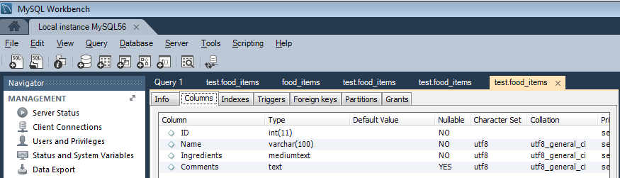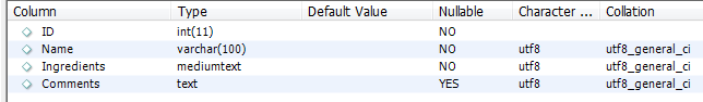 The attached SQL script creates a table named "food_items" with an "Ingredients" field that holds Chinese characters without any trouble on MySQL running in the following environment:
