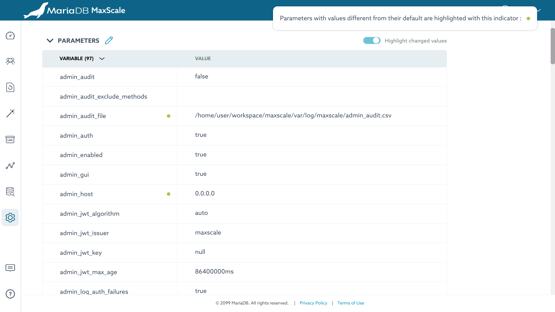 Parameters with values that differ from the default should be highlighted to enhance the user experience.