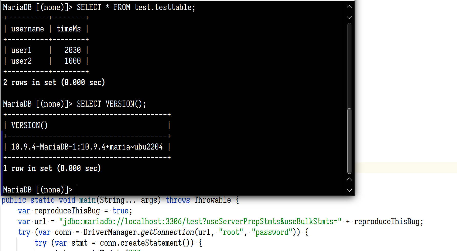 var url = "jdbc:mariadb://localhost:3306/test?useServerPrepStmts&useBulkStmts=" + reproduceThisBug;