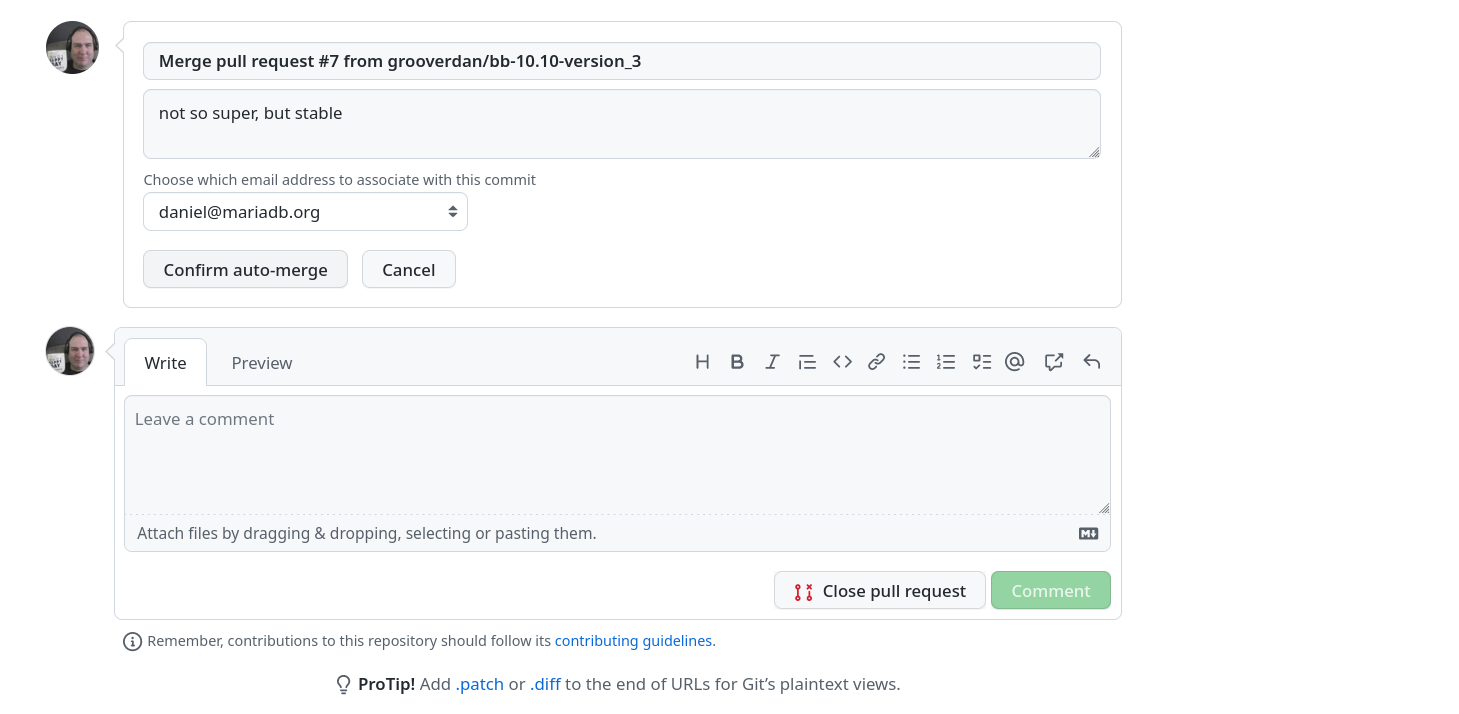 serg, as buildbot the github status checks only run on committed code, the only way to prevent changes like the mistake that happened is to "Require a pull request before merging" in the branch protection. With this failures will occur like https://github.com/grooverdan/mariadb-server/pull/5 For the convenience of workflows github has an automerge which enabled those with write access to the repository. After a PR is created those with access have an option to mark the PR as automerge where passing the protected branches (and the version check) will auto merge the PR. | ||||||||||||||