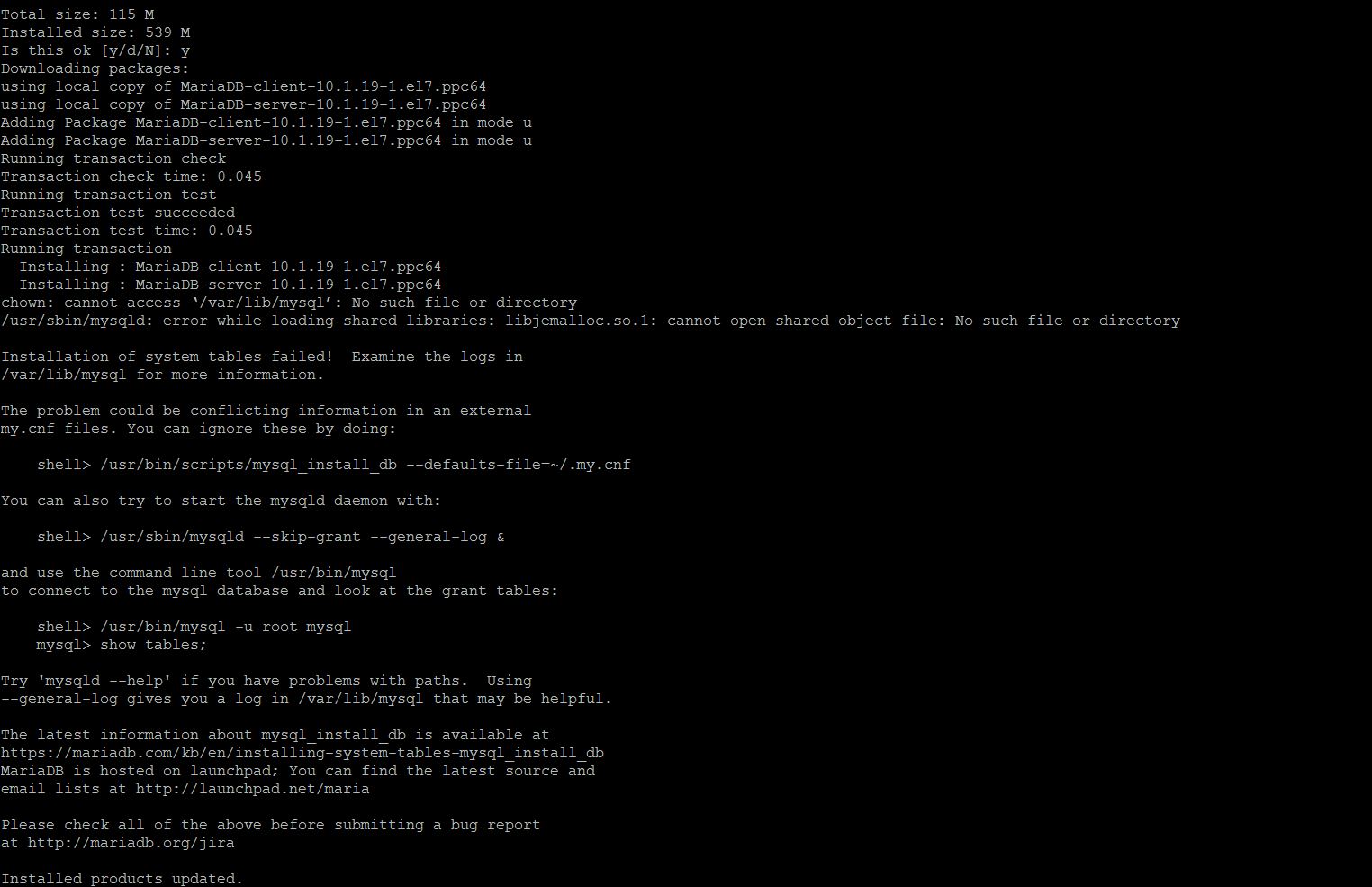 Hai finally MariaDB already installed with a 'little bit tricky'. I saw jemalloc.so.1 cannot be load by mysqld service so i tried running mysqld_safe with parameter malloc-lib and then pointing to /usr/lib64/libjemalloc.so.1 But seems not finish already, i must install system database which is mysql db itself. So i tried to copy mysql db folder on another mariadb server to my ppc server. Then mysqld_safe is running now But i know that way was 'naive' way, my question is why libjemalloc.so.1 cannot be loaded by mysqld script (which is mariadb service) on PPC? It doesnt supposed to be like that | |||||||||||||||||||||||||