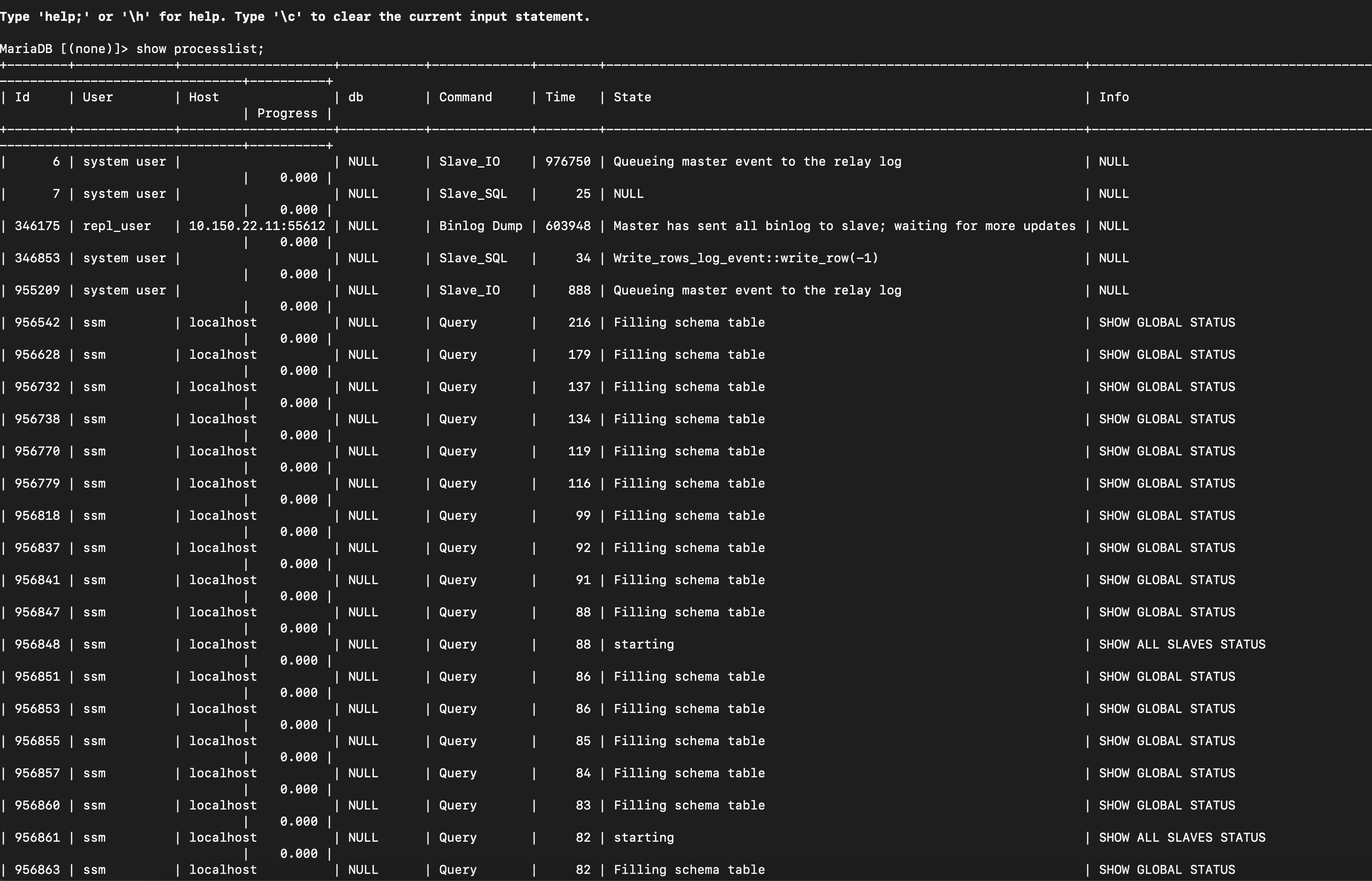 I am seeing something similar with these hanged queries that are in the state of "filling schema table" I'm 10.2.6 on Windows server 2008 R2. This issue only started after an upgrade from 10.1.22 TO 10.2.6 I'm not running Galera . the server hangs on several queries like "SHOW STATUS" killing the server has twice resulted in data innodb corruption and having rebuild the server with > 350GB of database is VERY time consuming. I am seeing similar error log entries which include the message "This could be because you hit a bug. It is also possible that this binary |
