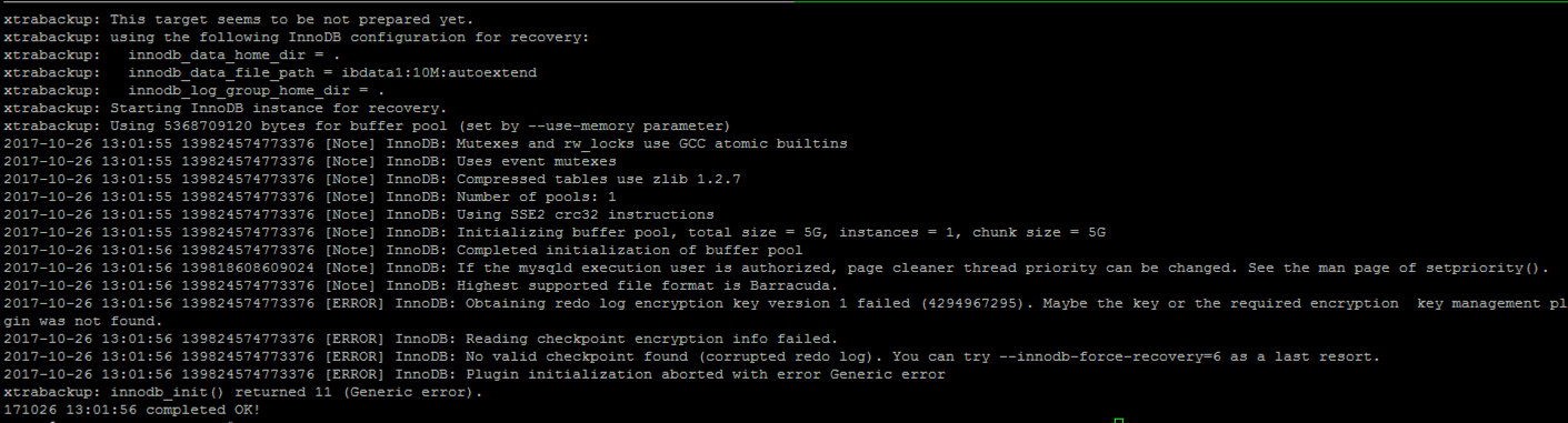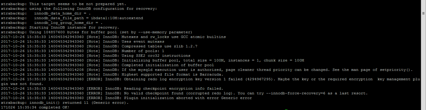 --prepare does not need user, or password, it does not contact any server.. , it does not understand --innodb-encrypt-log either, it is not a server. Kudos on getting text output. I hope now you can send also the backup-my.cnf in the backup directory, or maybe even a picture of it would also suffice | |||