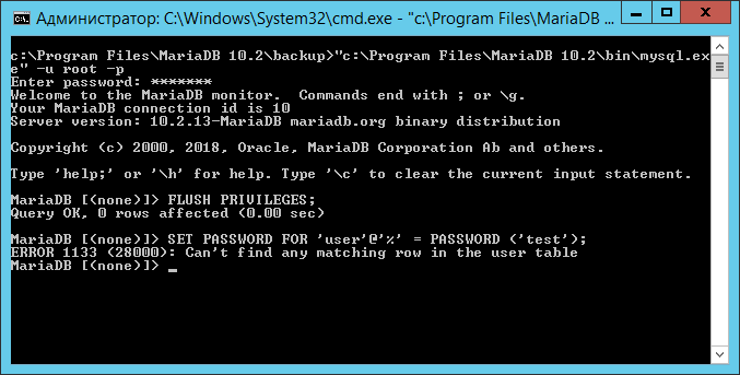 получаем ошибку ERROR 1133 (28000): Can't find any matching row in the user table или можно попробовать войти под этим пользователем - тоже дает ошибку.