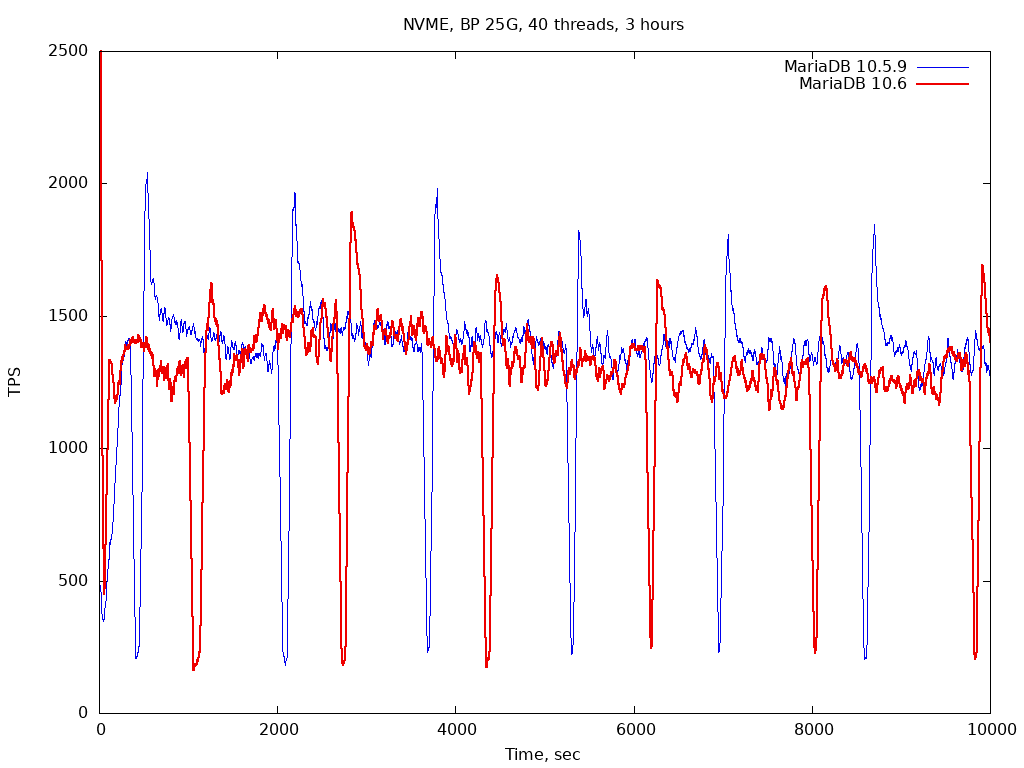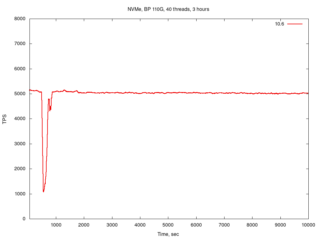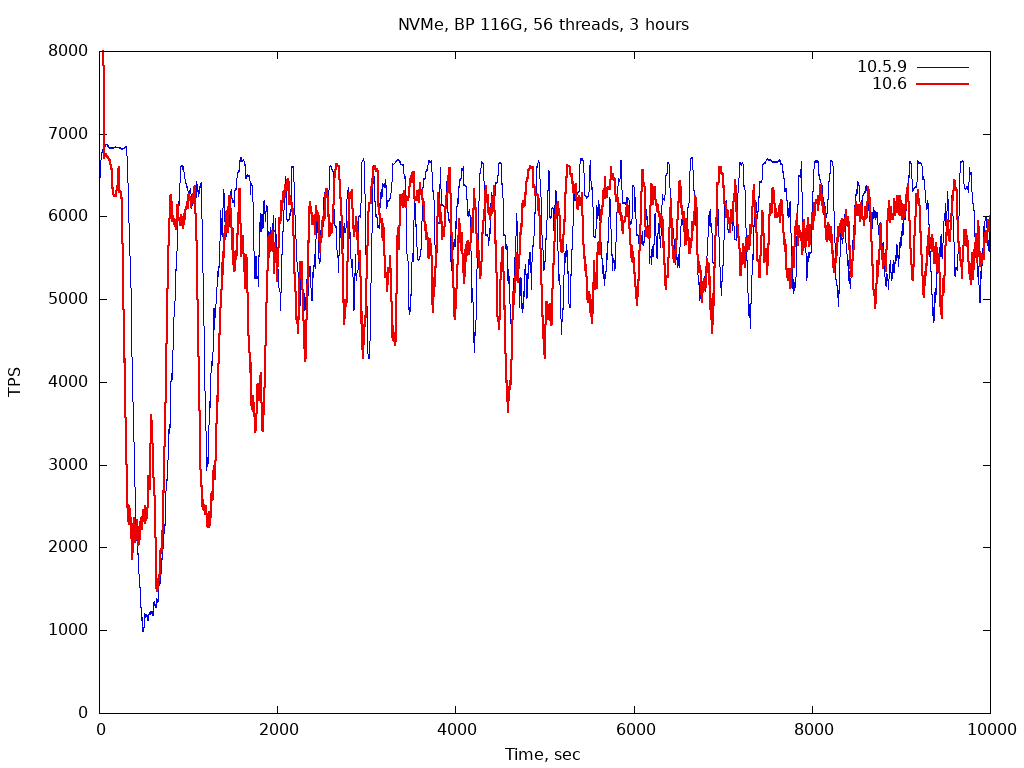 The recent commit 8751aa7397b2e698fa0b46ec3e60abb9e2fd7e1b significantly improves 10.6 performance, but there is still small performance degradation observed on short 10 minutes and long 3 hours TPC-C tests. I'm attaching plots for 3 hours test. | ||||||||||||||||||||||||||||||||||||||||||||||||