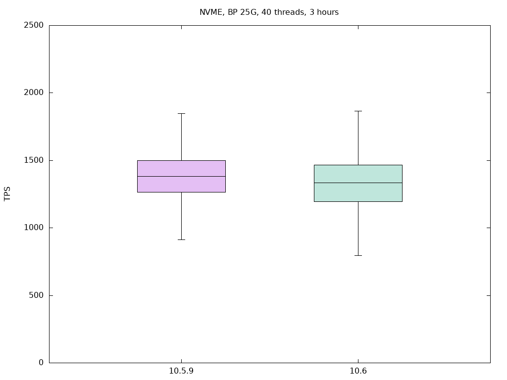 I also collected results for the IO bound TPC-C workloads. The test is exactly the same, except buffer pool is configured to 25GB and there are only 40 threads. The average TPS for 10.5.9 is 1337, while for 10.6 with the fix is 1284. The plots are attached (I'll try to tune out the waves later). | ||||||||||||||||||||||||||||||||||||||||||||||||