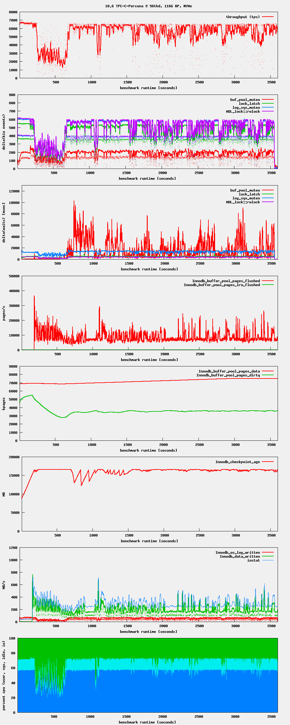 I'm evaluating MariaDB 10.5.9 performance against 10.5.5 as was described in https://www.percona.com/blog/2020/08/14/evaluating-performance-improvements-in-mariadb-10-5-5/ . Also I tried current 10.6 (as of 2ad61c678243dec2a808b1f67b5760a725163052) and noticed significant performance degradation against 10.5.9 on in-memory workload (see mariadb_all.png). Data size produced with sysbench-tpcc is 104G and buffer pool is 116G, so this is pure in-memory workload (all buffer_LRU_batch* metrics are zero). The testbed machine has slow NVMe drive (26 KIOPS for random writes and 320 KIOPS for random reads), 128GB RAM and 40 hyperthreads. While the original tests are 3 hours, 10.6 shows much slower performance right at the begin of the test, so I reproduced the problem on 10 minutes workloads. As tpcc_mariadb-10.6_116bp_600.stat and tpcc_mariadb-10.5.9_116bp_600.stat sysbench statistic reports there are 3845 TPS for 10.6 and 4965 TPS for 10.5.9. 10.6 and 10.5.9 have quite different I/O and CPU profiles shown in the .dstat files. Since this is in-memory workload, I suspected either doublewrite buffer or checkpointing. I reran the tests with doublewrite buffer switched off (_nodblwr.stat files): 10.6 is still slower than 10.5.9, but 10.6 is much more affected by switching off doublewrite buffer, than 10.5.9. So there is some problem with double write, but there is definitely something more. I collected some InnoDB LRU, flushing, checkpointing, and log metrics with 10 second intervals (*.metrics files), but I didn't find any significant differences except log_lsn_checkpoint_age (see checkpoint.png). There were more or less the same number of checkpoints, page flushes, and log writes. 10.6 was built with io_uring, but I checked with gbd, that there were no aio_uring::submit_io() calls. |