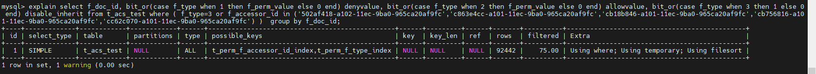 mysql version: 5.7.25 two querys is same: select f_doc_id, bit_or(case f_type when 1 then f_perm_value else 0 end) denyvalue, bit_or(case f_type when 2 then f_perm_value else 0 end) allowvalue, bit_or(case f_type when 3 then 1 else 0 end) disable_inherit from t_acs_test where ( f_type=3 or f_accessor_id in ('502af418-a102-11ec-9ba0-965ca20af9fc','c863e4cc-a101-11ec-9ba0-965ca20af9fc','cb18b846-a101-11ec-9ba0-965ca20af9fc','cb756816-a101-11ec-9ba0-965ca20af9fc','cc62c070-a101-11ec-9ba0-965ca20af9fc') ) group by f_doc_id the table size is 102917 rows, the query return about 3w |