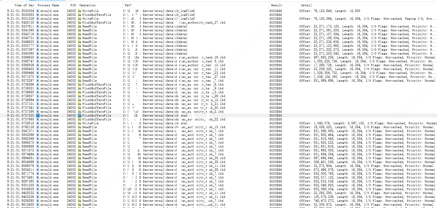 Stop the database instance using mysqladmin shutdown,More than 24 hours without stopping. Msyqld has been unable to stop and runs until "InnoDB: FTS optimize thread exiting” 2023-09-22 9:16:30 0 [Note] C:\Server\mysql\bin\mysqld.exe (initiated by: sysdba[sysdba] @ [127.0.0.1]): Normal shutdown The information seen by ProcessMonitor has been undergoing flushbufferfile and readfile operations |