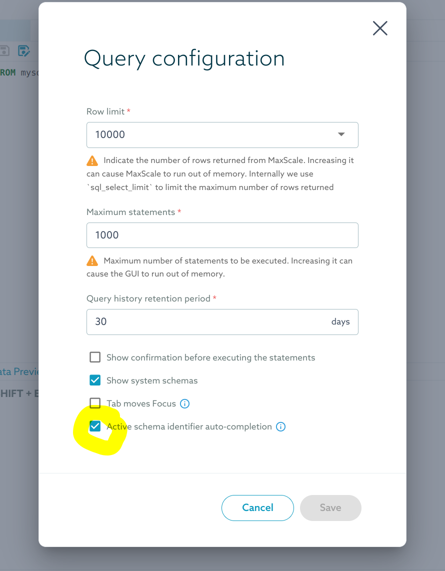 [MXS-4017] Query Editor Auto completion for all identifier names of the active schema Created: 2022-02-22 Updated: 2023-12-12 Resolved: 2023-11-02 |