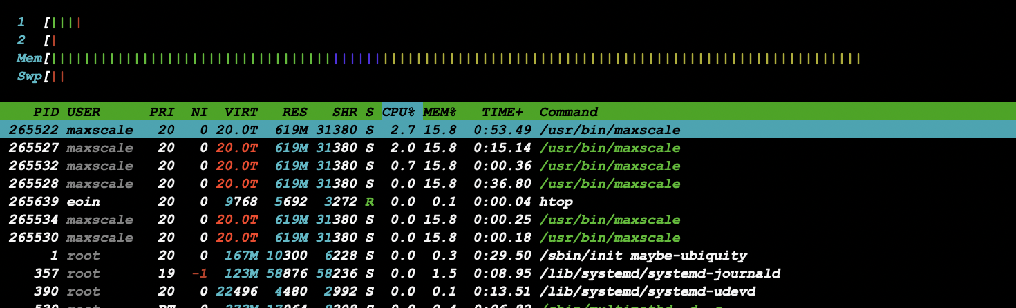 Checking the htop command at this stage (today is Monday here, around noon), MaxScale didn't crash. Memory usage increased to 1.33G. VIRT size is currently showing 1795M with RES size of 1132M. I didn't touch query_classifier_cache_size setup, hence I believe it's using around 615M ish? If this result is expected, all good. If not, please let me know. | ||||||||||||||||