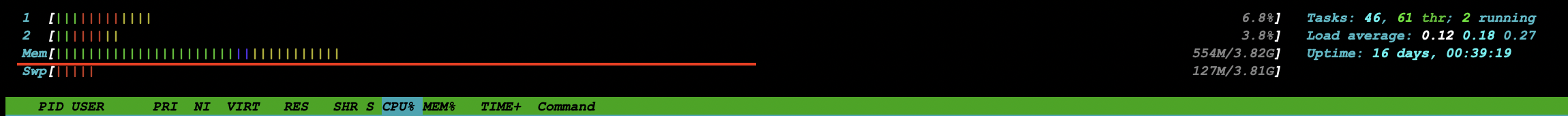 In htop command, the memory usage graph was mucking around 950M. VIRT was around 1630M, and RES was smaller - around 570M. I don't know if those figures are looking good to you or not, but it didn't bust at least, which is a good thing. I've restarted the service to record the initial memory usage in htop (it was around 270M) and I'll let it run during the weekend and check on Monday morning to see how much it grows. | ||||||||||||||||