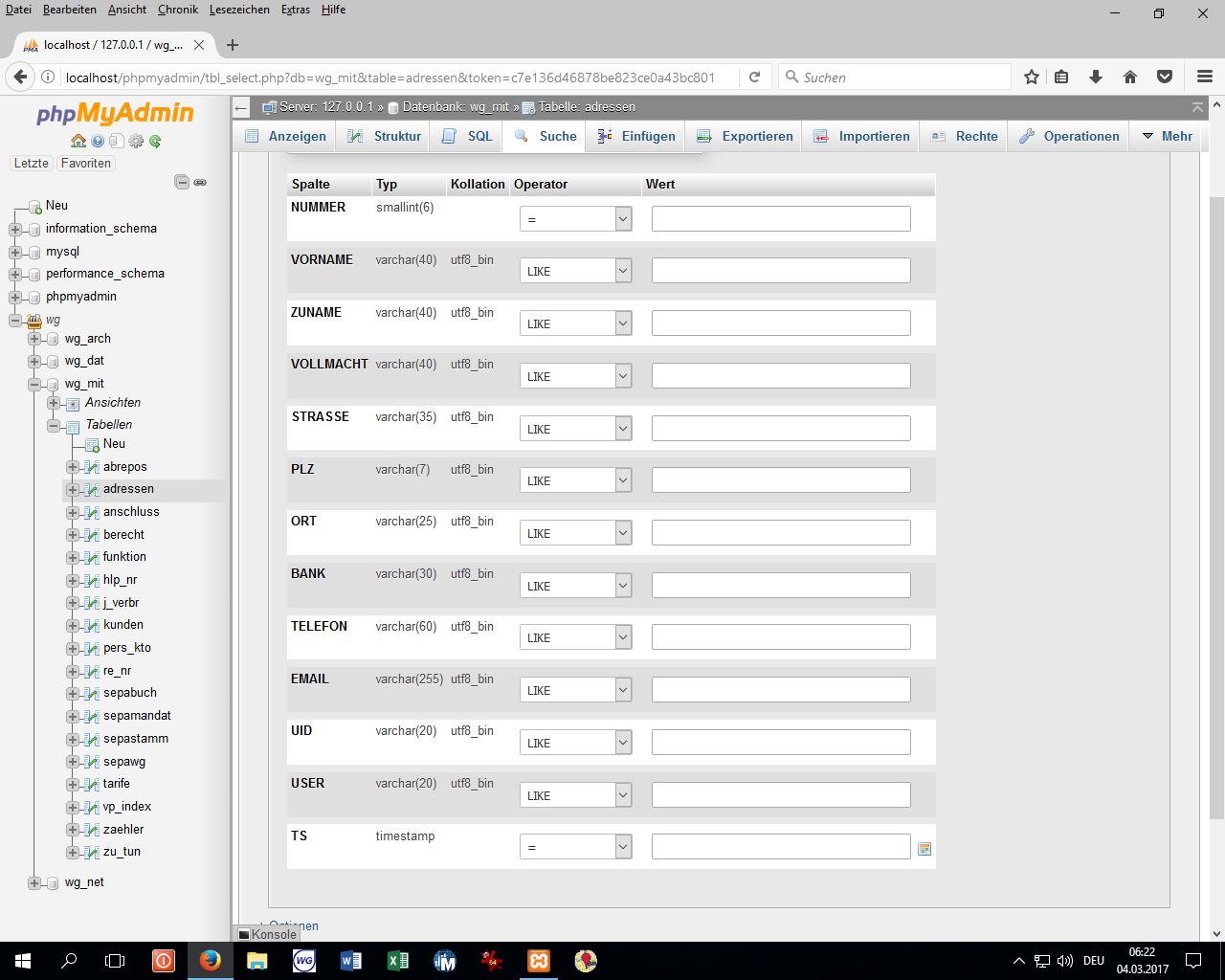 Thanks once again - that helps. Would be possible also to see definition of the table `adressen`(SELECT * Doesn't it have 'binary' or 'collate utf8_bin' for varchar fields/table? The thing is, that DAO request all fields as SQL_C_BINARY, and it does so because SQLDescribeCol returned SQL_VARBINARY for seemingly all varchar fields. |